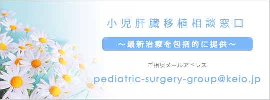 慶應義塾大学臓器移植センター(https://www.hosp.keio.ac.jp/annai/shinryo/organ-transplantation-center/)では、子どもから大人まで肝臓移植が必要な患者さんに最新治療を包括的に提供する体制を整えております。胆道閉鎖症・原発性硬化性胆管炎・肝芽腫・Wilson病・自己免疫性肝炎・劇症肝炎・代謝性疾患などを対象に肝臓移植をおこなっており、治療でお困りのお子さんから成人の方まで、多くの患者さんの治療にあたっています。これまで350例以上の生体・脳死肝臓移植を行なっており、慶應義塾大学病院での小児肝移植では5年生存率は92.4%(胆道閉鎖症などの胆汁鬱滞性疾患では5年生存率96.3%)であり、全国平均の87.7%と比べても成績が良好です。肝臓移植に関して分からないことや心配なこと、もっと詳しく聞きたい事などありましたら、下記のメールアドレスにてご相談ください。